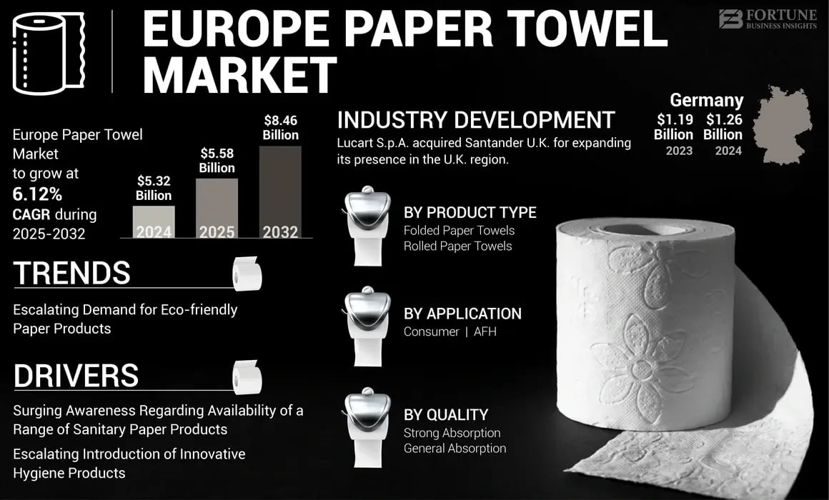 According to Fortune Business Insights Europe paper towel market size was valued at USD 5.32 billion in 2024. The market is projected to reach from USD 5.58 billion in 2025 to USD 8.46 billion by 2032, exhibiting a CAGR of 6.12% during the forecast period.