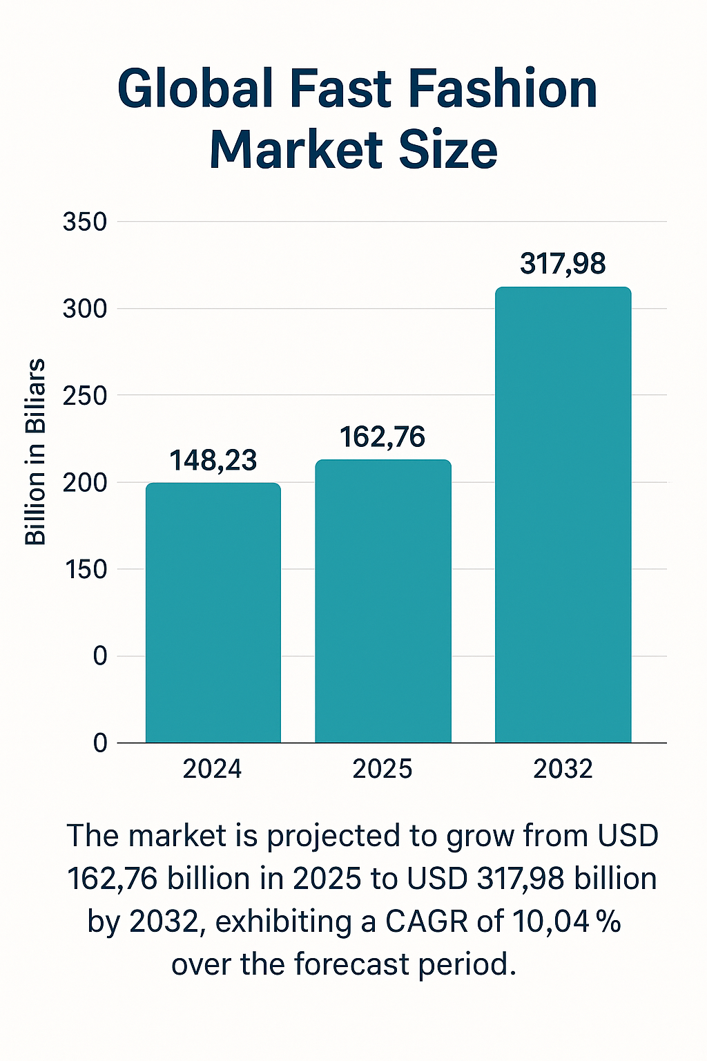 According to Fortune Business Insights Global Fast Fashion Market size was valued at USD 148.23 billion in 2024. The market is projected to grow from USD 162.76 billion in 2025 to USD 317.98 billion by 2032, exhibiting a CAGR of 10.04% over the forecast period.
