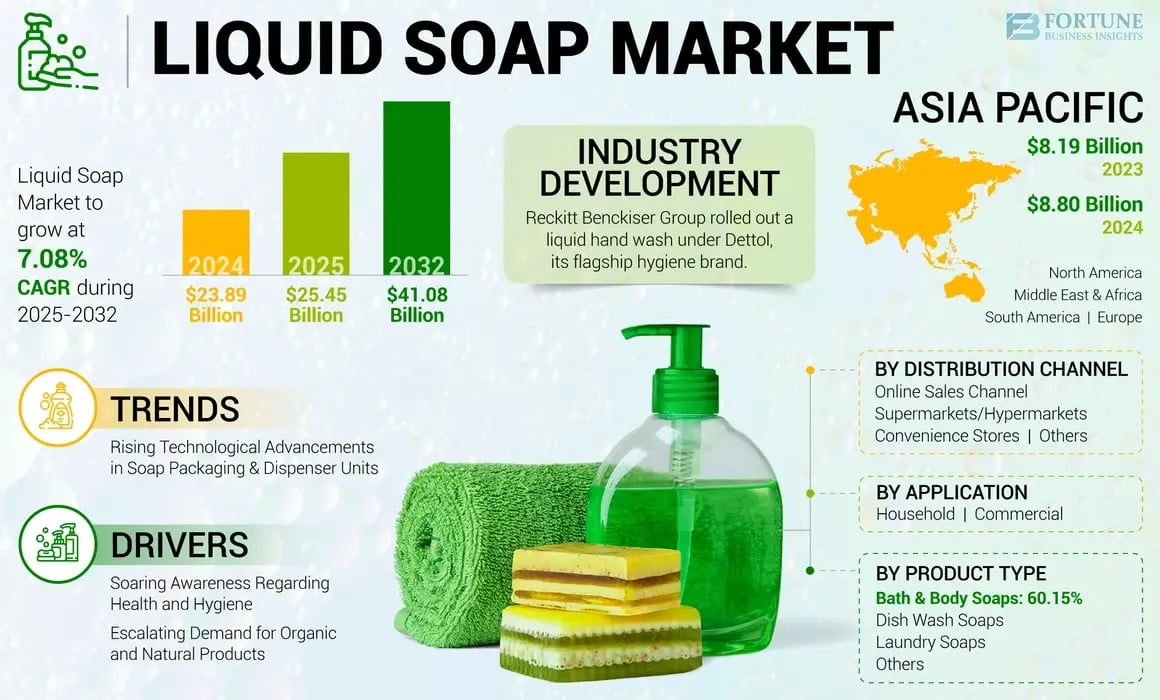 According to Fortune Business Insights Global Liquid Soap Market size was valued at USD 23.89 billion in 2024. The market is projected to grow from USD 25.45 billion in 2025 to USD 41.08 billion by 2032, exhibiting a CAGR of 7.08% during the forecast period.