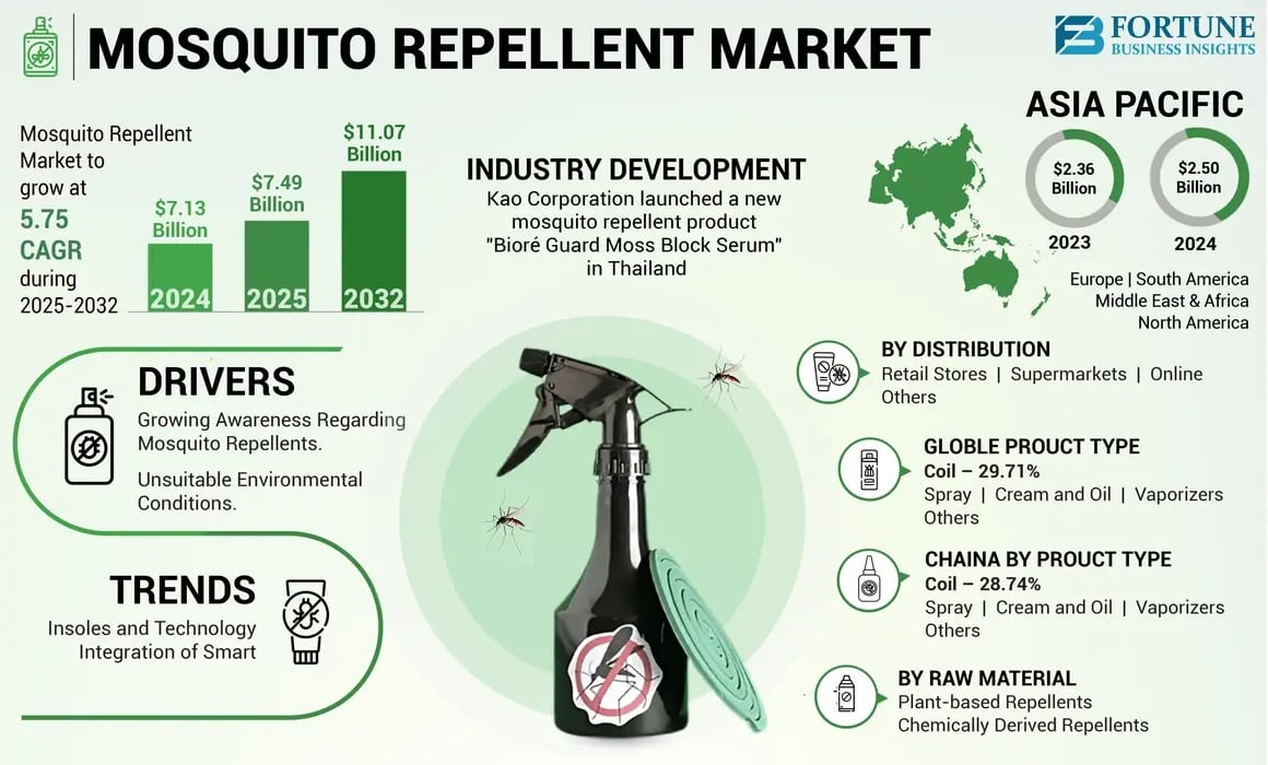 According to Fortune Business Insights the global Mosquito Repellent Market size was valued at USD 7.13 billion in 2024. The market is projected to grow from USD 7.49 billion in 2025 to USD 11.07 billion by 2032, exhibiting a CAGR of 5.75% during the forecast period. The rising temperature on the earth due to growing greenhouse gases in the atmosphere has contributed to a rise in mosquito population. This has elevated the need for products to repel mosquitoes, thus driving market augmentation.