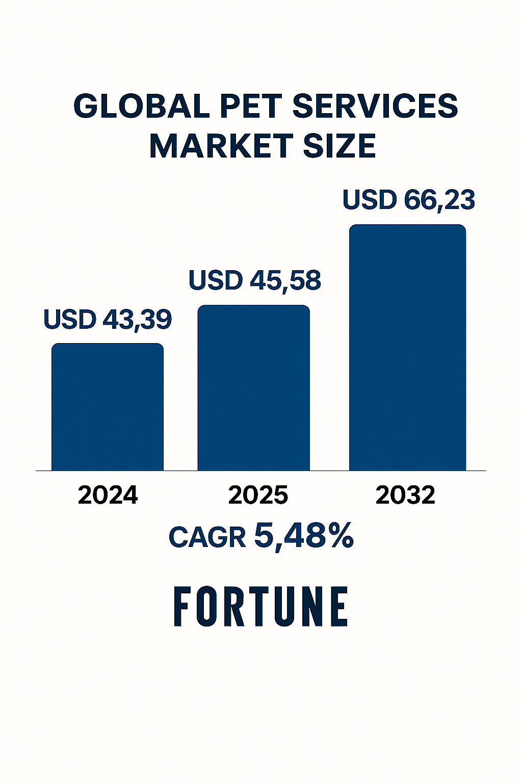 The global pet services market size was valued at USD 43.39 billion in 2024. The market is projected to grow from USD 45.58 billion in 2025 to USD 66.23 billion by 2032, exhibiting a compound annual growth rate (CAGR) of 5.48% during the forecast period.