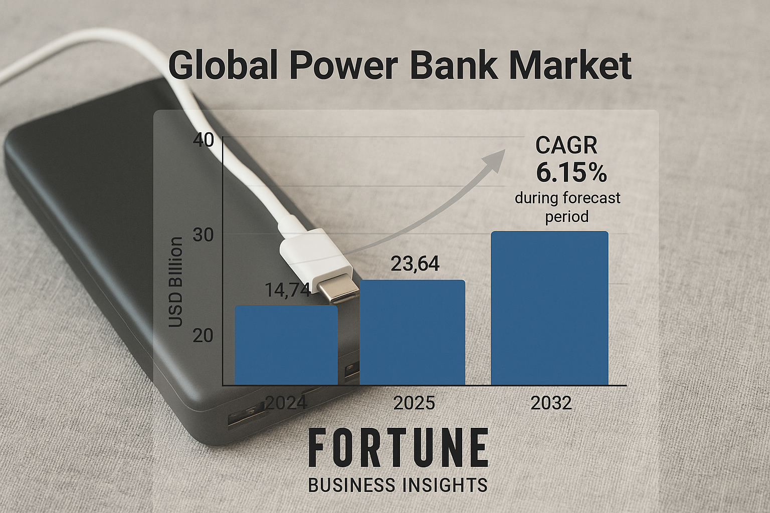 According to Fortune Business Insights Global Power Bank Market size was valued at USD 14.74 billion in 2024. The market is projected to grow from USD 15.56 billion in 2025 to USD 23.64 billion by 2032, exhibiting a CAGR of 6.15% during the forecast period. Asia Pacific dominated the power bank market with a market share of 43.89% in 2024.