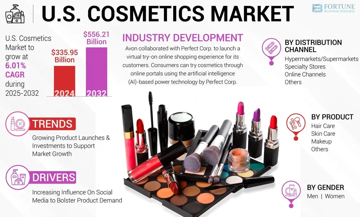 According to Fortune Business Insights U.S. is the largest market for cosmetic products globally. The U.S. cosmetics market size is projected to record 6.01% CAGR during the forecast period. The global market is estimated to grow from USD 335.95 billion in 2024 to USD 556.21 billion by 2032.